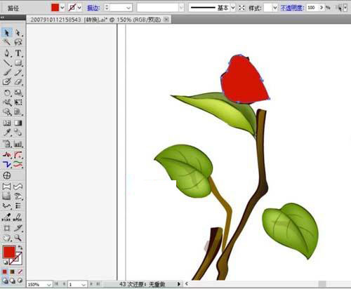 第5步、在最上面的绿叶旁边绘制出一片花瓣的基本路径,我们用粉红色的渐变填充,边缘用暗棕色进行描边。