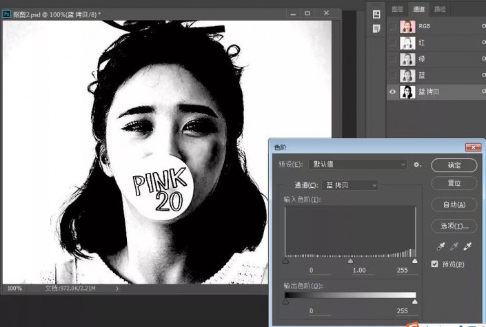 ctrl+L 调出色阶 拉大头发与背景的色差
