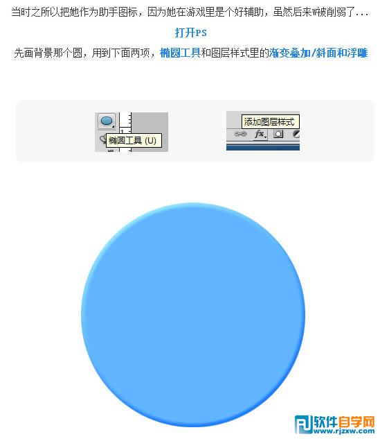 | 1、打开PS,先画背景那个圆,用到下面两项,椭圆工具和图层样式里的渐变叠加,斜面和浮雕。 |