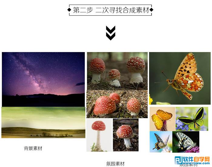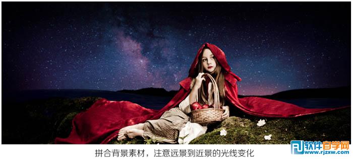 | 5、拼合背景素材,注意远景到近景的光线变化。 |