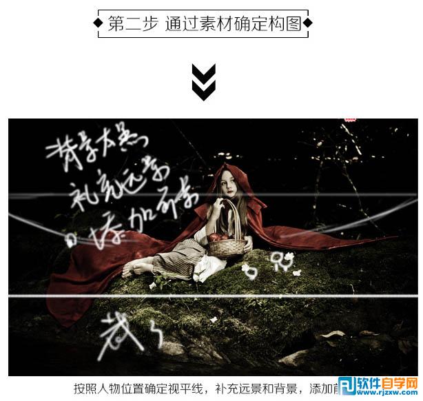 | 3、通过素材确定构图。 按照人物位置确定视平线,补充远景和背景,添加前景。 |