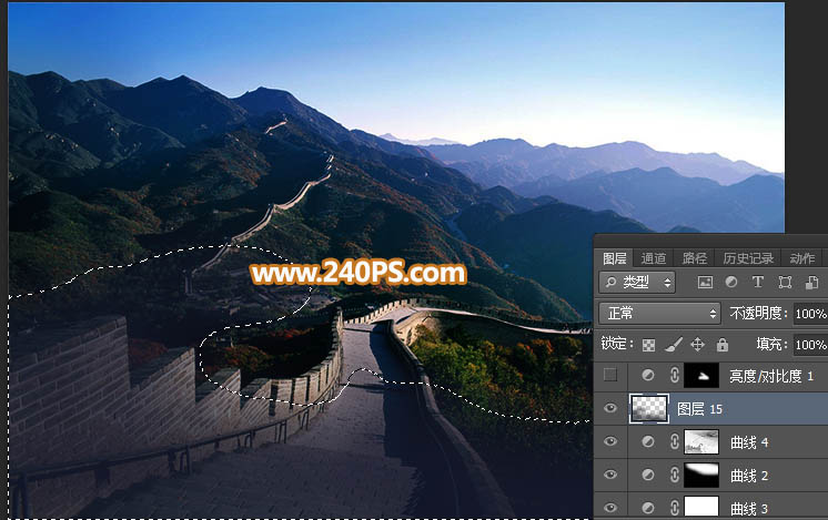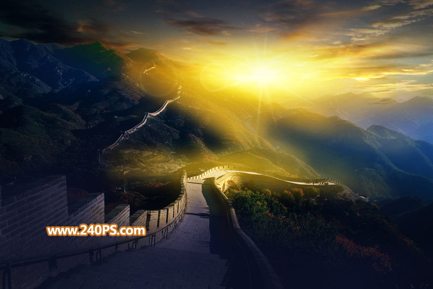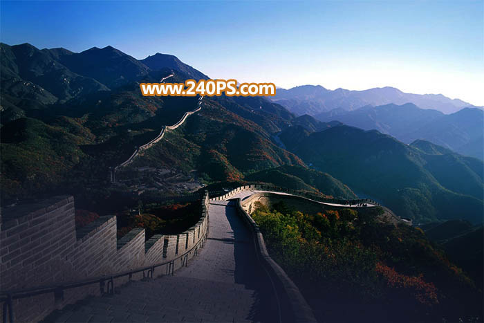 素材拍摄的非常大气,只是图片中没有霞光,缺失一些韵味;前期我们先把图片整体压暗,营造出日出时候的环境;同时局部受光区域需要渲染一些暖色,并提高亮度;最后更换霞光素材,局部再渲染出阳光效果。