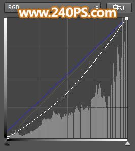 2、创建曲线调整图层,对RGB,蓝通道进行调整,参数设置如下图,确定后把蒙版填充黑色,然后用柔边白色画笔把天空过亮的部分涂暗一点,如下图。
