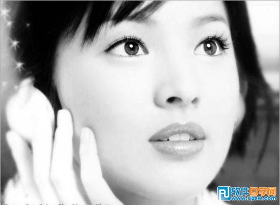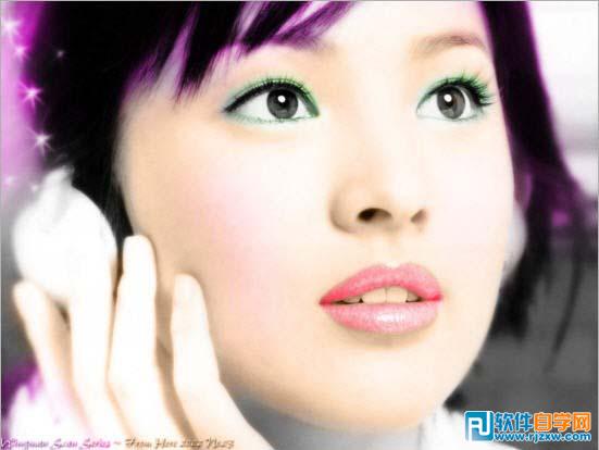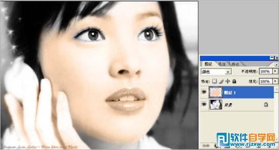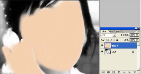 | 最终效果 | 1.首先,新建图层1,用压感笔绘制脸部,我用的颜色为:R246.G207.B176 ,当然这个不需要太仔细,大概把脸部描一下就可以,脸部中可以加大压力,直接涂抹。为了让边缘显得不那么生硬,在绘制边缘时只要减轻压感笔的压力就可以了如<图1> |  <图1> | | 2.绘制完成之后,用附送的无线鼠标点图层面板中的更改模式下拉菜单,在弹出来的下拉菜单中选择颜色模式,就得到这样的效果,感觉差不多了,可是……MM的眼睛却成黄色的了,这样会让人以为是生病了,把这么一个PL的MM弄成了黄眼了,多可惜啊!用橡皮把图层1中眼睛的位置擦除干净,在涂眼角的部分的时候,用压感笔轻轻的抹过就可以,中间部位就加大下笔的压力,压感笔的压感技术让我们轻松完成压感笔的压感技术让整个涂抹过程更方便更精确了,要是以前,这个涂抹过程可能会花掉比现在多几倍的时间,哈哈!这样就复原了美女本来神采熠熠的漂亮眼睛如<图2> |  <图2> | |