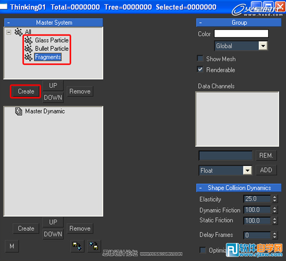 在Particle Group Tree视图下,单击Create创建Master System。 命名组Glass Particle。创建两个其他群体。命名为Bullet Particle和Fragments。(图02)