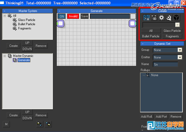 进入Modify面板,并点击Properties中的Thinking(也可以使用Alt + Shift + P来打开,或Alt + Shift + C关闭ThinkingParticles 3)。在DynamicSet Tree视图中,选择Master Dynamic,禁用Edit on the fly看到实时的变化,启用Show Mesh。(图01)