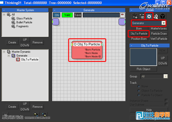 选择“操作”图标,然后从下拉列表中选择Generator,现在会显示Obj.To Particle,然后点击查看示意图,并添加这个节点到DynamicSet。(图05)