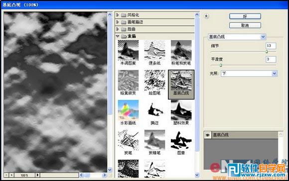 | 3、执行菜单栏中的“滤镜”“素描”“基底凸现”命令,设置细节为13,平滑度为3,光照方向为下,如图04所示,图像效果如图05所示。 |