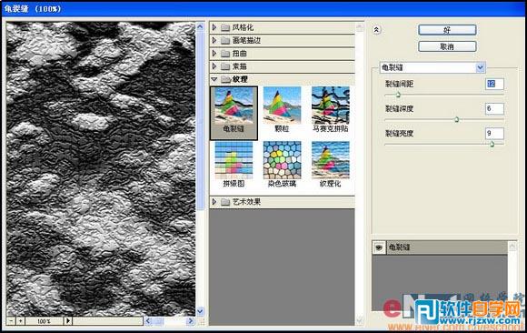 | 4、执行菜单栏中的“滤镜”“纹理”“龟裂缝”命令,设置裂缝间距为12,深度为6,亮度为9,如图06所示,图像效果如图07所示。 |