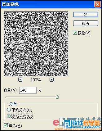 | 5、在该图层上新建一个图层,填充白色,执行菜单栏中的“滤镜”“杂色”“添加杂色”命令,设置数量为340,高斯分布,勾选单色,如图08所示,效果如图09所示。 |