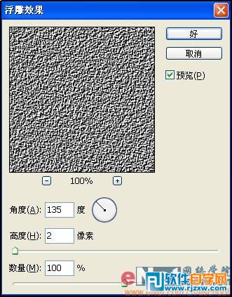 | 6、执行菜单栏中的“滤镜”“风格化”“浮雕效果”命令,设置浮雕角度为135,高度为2,数量为100%,如图10所示,效果如图11。所示设置图层的透明度为50%,效果如图12所示。 |