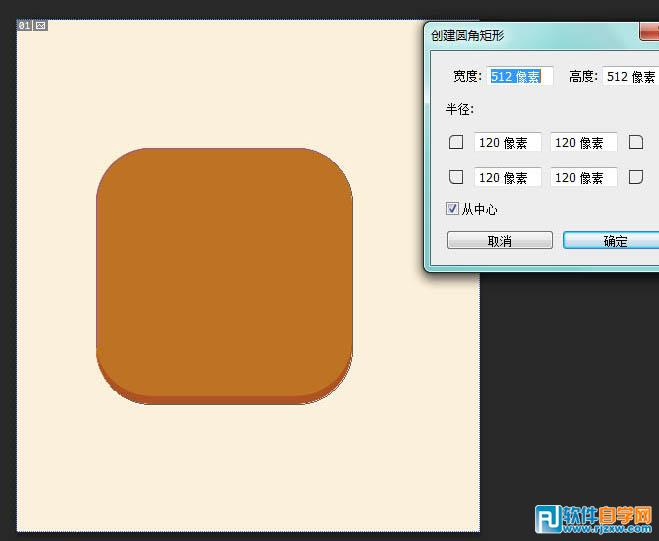 | 2、先创建一个圆角矩形,大小为512px*512px,半径120px,记住左上角是形状哦。 搞定后填充颜色#c47420,命名“icon base”。 |