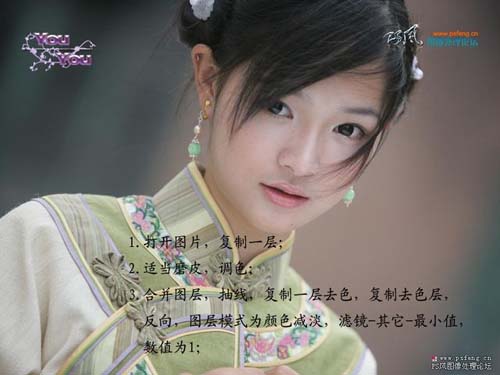 | 1、打开原图素材,复制一层。 2、适当磨皮调色。 3、合并图层,复制一层去色,复制去色层,按Ctrl + I反相,图层混合模式改为“颜色减淡”,执行:滤镜 > 其它 > 最少值,数值为1。 |