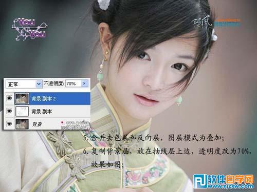 | 5、合并去色层和反相层,图层混合模式改为“叠加”。 6、复制背景层,放在抽线层上边,透明度改为:70%。 |