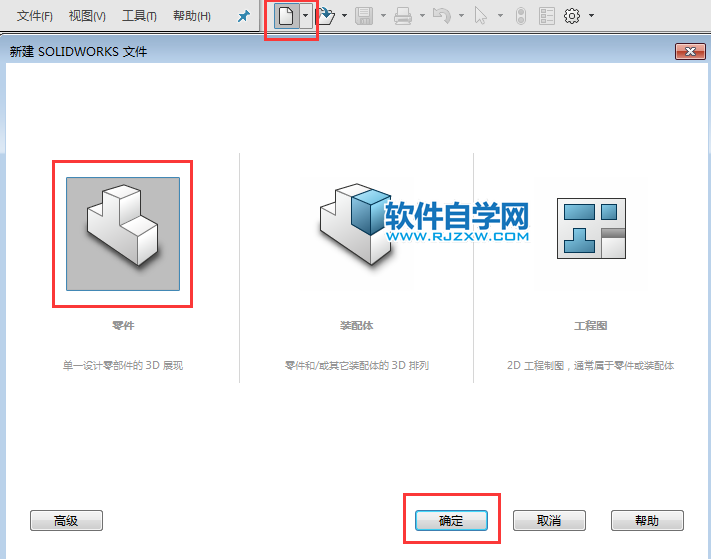 1、打开Solidworks软件,点击新建图标,点击零件,点击确定。