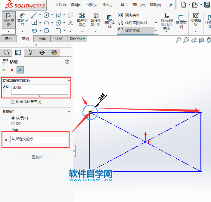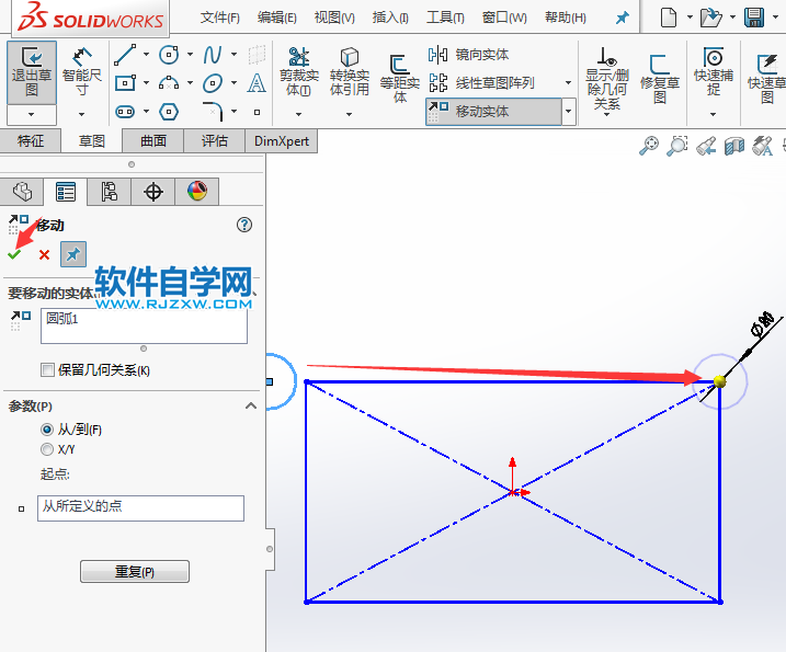 6、然后就可以点击另一个端点。这样圆就移动到另一个端点上了。