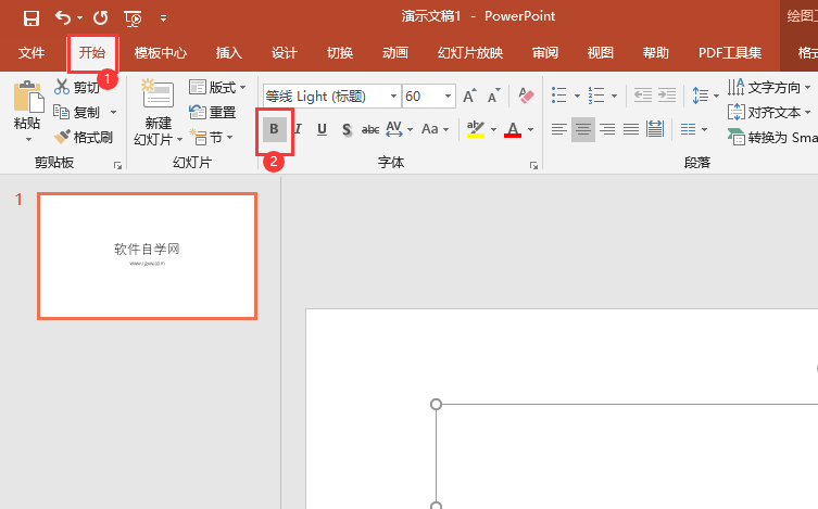 ppt怎么给文字加粗 日期:2025-12-11 13:00:40 栏目:软件教程 浏览:9 评论:0 1、打开PPT软件,选择文字。 2、点击开始菜单,点击B的图标。 3、这样文字就加粗了。 4、也可以按ctrl+B也可以给文字加粗。 上一篇:巧用通道制作非主流图片 下一篇:photopshop巧用画笔把人物脸上的痘点掉 相关推荐 PS怎么通过图层新建画板 chatgpt从哪开始学 chatgpt有可能被颠覆吗 动车图片,使用PS径向模糊滤镜制作疾驰的动车图片 评论留言 我要留言 ◎欢迎参与讨论,请在这里发表您的看法、交流您的观点。 昵称:* 邮箱:* 网址: 内容: 取消回复