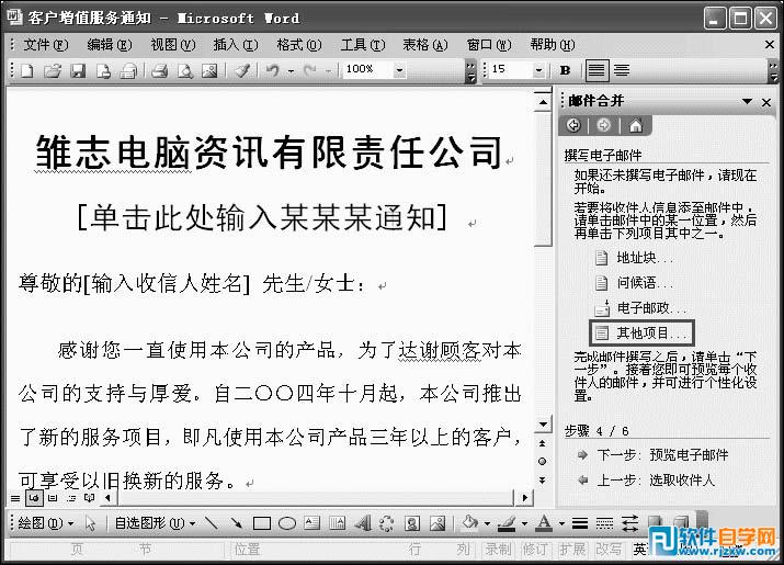 (3)打开主文档,单击“工具→信函与邮件→邮件合并”命令,打开“邮件合并”对话框(呈现在窗口右侧)。