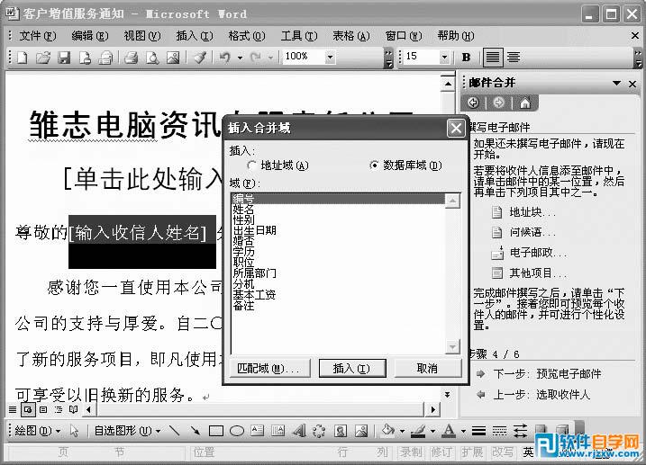 (9)选中“姓名”。接着单击“插入”按钮,用“姓名”域替换文档中的“[收信人姓名]”。如果其他地方还需要插入相对应的数据源中的关键字,同样使用上面的方法来完成。