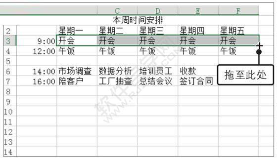 2、填充单元格。按住鼠标左键不放,拖动鼠标至单元格F3处,释放鼠标后可看见单元格区域B3:F3中均填充了“开会”文本,如图所示。