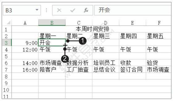 1、在单元格中输入文本。打开原始文件,在单元格B3中输入“开会”文本,将鼠标指针移至单元格B3右下角,使其呈十字形状,如图所示。
