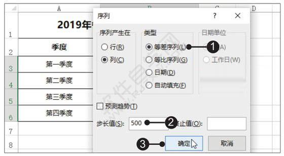 3、设置序列类型和步长值。弹出“序列”对话框,在“类型”选项组中选择填充的序列类型,如单击“等差序列”单选按钮,然后设置步长值为“500”,单击确定”按钮,如图所示。