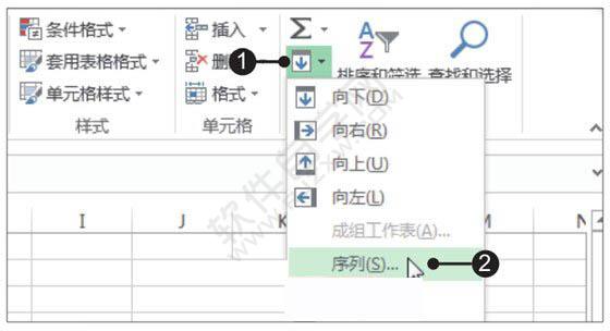 3、单击“序列”选项。单击“开始”选项卡下“编辑”组中的“填充”按钮,在展开的下拉列表中单击“序列”选项,如图所示。