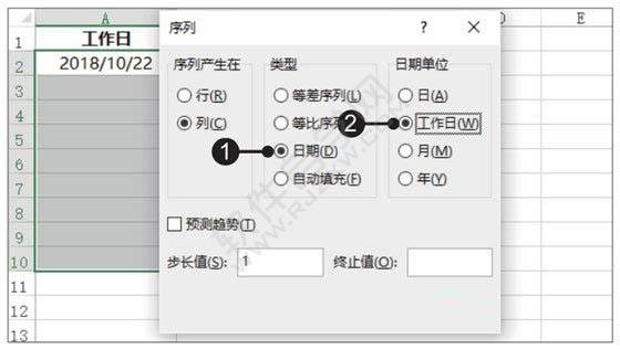 4、设置日期填充。弹出“序列”对话框,单击“类型”选项组中的“日期”单选按钮,单击“日期单位”选项组中的“工作日”单选按钮,最后单击“确定”按钮,如图所示。