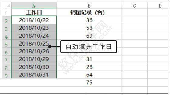 5、填充工作日结果。返回工作簿窗口,此时在选择的单元格区域可看到所填充的日期排除了周末,如图所示。