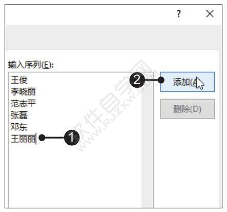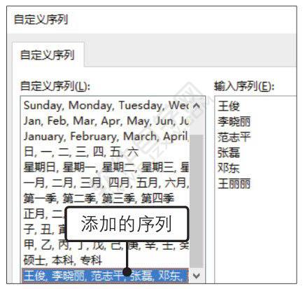 3、输入自定义序列。弹出“自定义序列”对话框,在“输入序列”列表框中输入自定义序列,利用【Enter】键换行,输入完毕后单击“添加”按钮,如图所示。