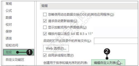 2、选择编辑自定义列表。弹出“Excel选项”对话框,在左侧单击“高级”选项,在右侧单击“常规”组中的“编辑自定义列表”按钮,如图所示。