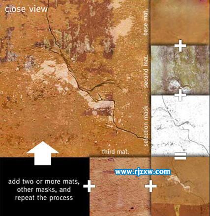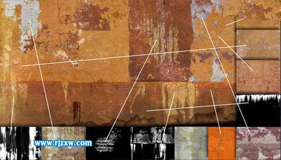第2步、墙体:在参考图片的辅助下,我决定制作一张复杂的贴图,因此我认为必须在Photoshop中对贴图进行处理,才能制作出有污痕的纹理。墙体的大部分区域被不同的颜色粉刷过很多次,因此墙体有很多图层,使得它的纹理非常多样。我使用了7种不同的纹理,这些纹理带有许多蒙板,在下面你可以看到如何选择蒙板和混合图层。
