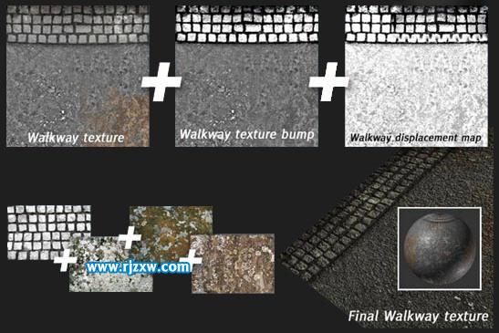 第7步、人行道:这是一个棘手的部分,我必须在Photoshop中合成出这个贴图,因为我想制作出一张将混凝土质感与典型的葡萄牙风格道路完美融合的贴图。因此我使用了凹凸和置换两种贴图来制作这种纹理效果。