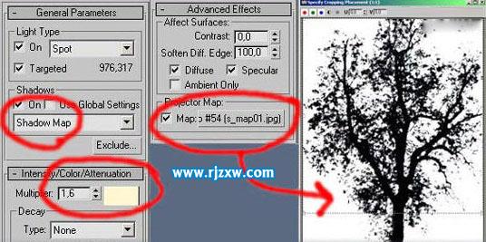 第8步、我的场景几乎制作完了。里斯本市的光照是很惊人的:城市的街道笔直,种有树木,制作一个阴影贴图的投影是必要的,我使用了一张阴影贴图,选择了它的一部分来生成阴影和模糊特效。在这个场景中使用了两个Target Spots(目标聚光灯):一个灯光设置为2.5 Multiplier(亮度倍增),这样做可以在墙体上投射出很强的高光,光照颜色为黄色RGB(255;246;210),选择Shadow Map(阴影贴图)方式;并为Projector Map(投影贴图)指定这张树木阴影贴图。另一个灯光是由第一个客隆出来的,1.5 Multiplier(亮度倍增),光照颜色和阴影贴图相同。