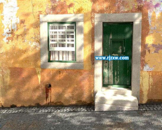 第5步、房门:再次使用了Blend(混合)材质,因为时间的原因房门已经被腐蚀了,给它指定一张Dirt(污垢)贴图作为蒙板就完美了。