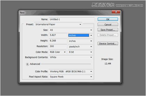 1、首先,我们来新建文件。这里我们需要设置长、宽还有分辨率。在我们的例子中,我打算使用A5的纸张大小,选择“国际标准纸张”,然后选择A5大小,分辨率则选择300DPI——为了打印出来的足够清晰。