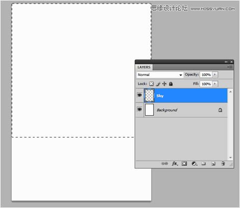 2、现在文件就创建好了,我们首先来创建合适的背景。在我们的例子中,图片的上半部分是比较亮的颜色,而下半部分则比较灰暗,这将有助于我们创建剪影效果。首先,我们新建一个图层(快捷键为Ctrl + Shift + N)并将其命名为Sky(天空)。然后使用矩形选框工具选择上部约三分之二的部分。