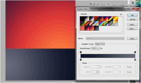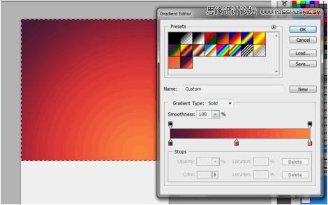 3、现在,使用渐变工具,我们将要在选框工具的范围内创造一种对角的渐变。当然了,你可以使用你想要的颜色。在本例中,我们用了紫色,亮红色和橙色来做,这样很好地契合了我们“怀旧”的主题。
