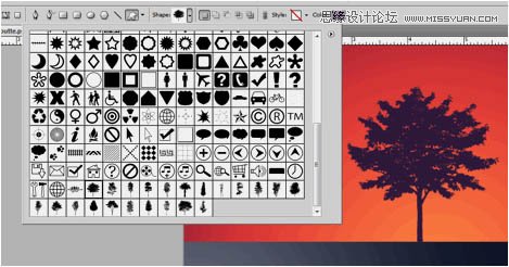 5、好极了,现在我们可以来添加剪影轮廓了。在我们的例子当中,我们使用了树的剪影轮廓。你也可以将CSH文件添加到Photoshop的素材库中。将它弄到Photoshop里面来后,缩放并将它置于天空的那一部分,这样基本的剪影效果就出来了。