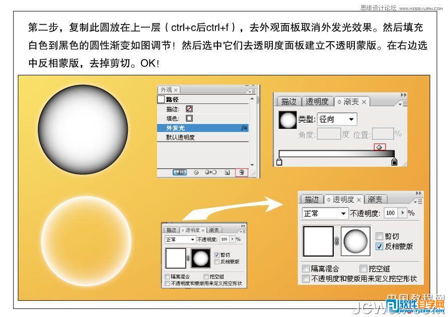 第二步,复制此圆放在上一层(ctrl+c后ctrl+f),去外观面板取消外发光效果。然后填充白色到黑色的圆性渐变如图调节!然后选中它们去透明度面板建立不透明蒙版。在右边选中反相蒙版,去掉剪切。OK!