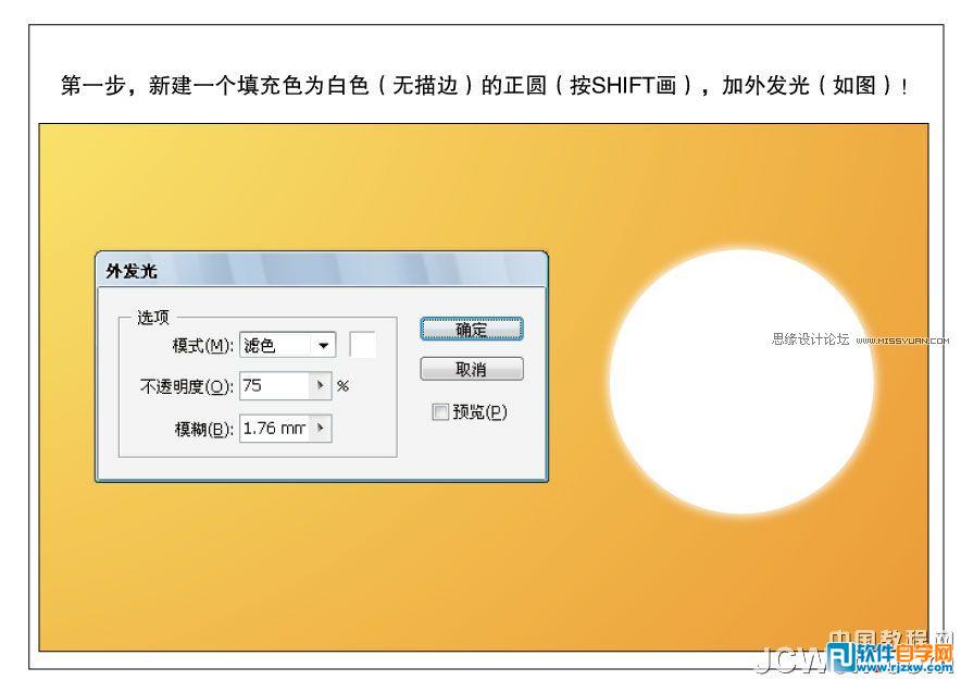 第一步,新建一个填充色为白色(无描边)的正圆(按SHIFT画),加外发光(如图)!