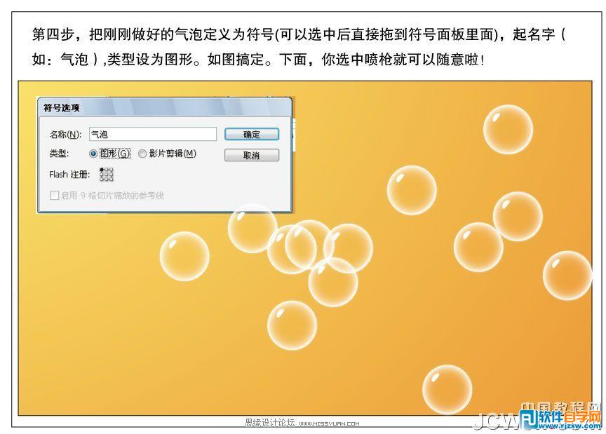 第四步,把刚刚做好的气泡定义为符号(可以选中后直接拖到符号面板里面),起名字(如:气泡),类型设为图形。如图搞定。下面,你选中喷枪就可以随意啦!