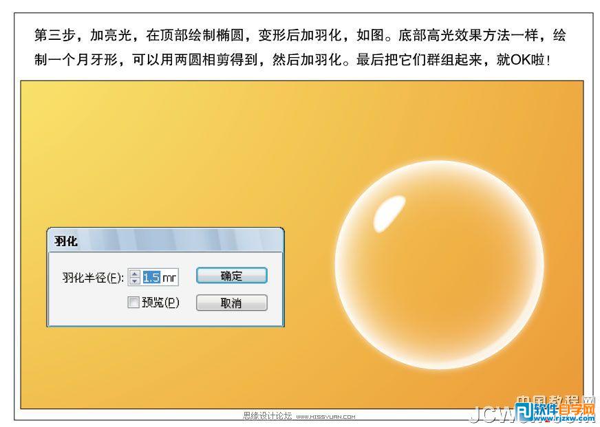 第三步,加亮光,在顶部绘制椭圆,变形后加羽化,如图。底部高光效果方法一样,绘制一个月牙形,可以用两圆相剪得到,然后加羽化。最后把它们群组起来,就OK啦!