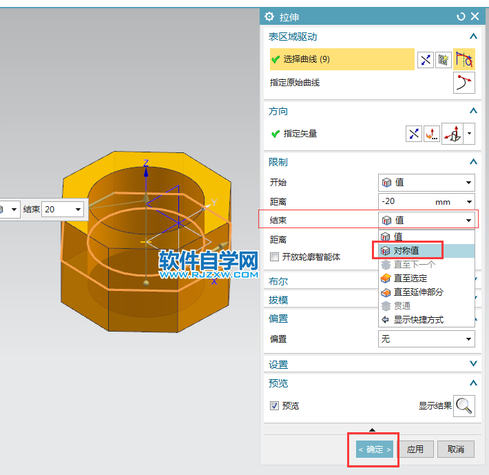 5、退出草图,限制结束设置对称值,参数设置20mm。