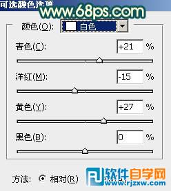 | 2、创建可选颜色调整图层,对红、黄、绿、白、中性色进行调整,参数设置如图3 - 7,效果如图8。这一步主要把图片中的绿色调暗,高光区域增加淡青色。 |