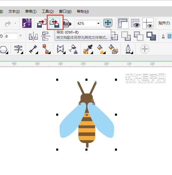 第1步、打开cdr软件,新建文件,绘制一个图案,然后选中对象后,点击导出图标或是按Ctrl+E键也可以。