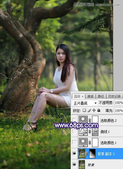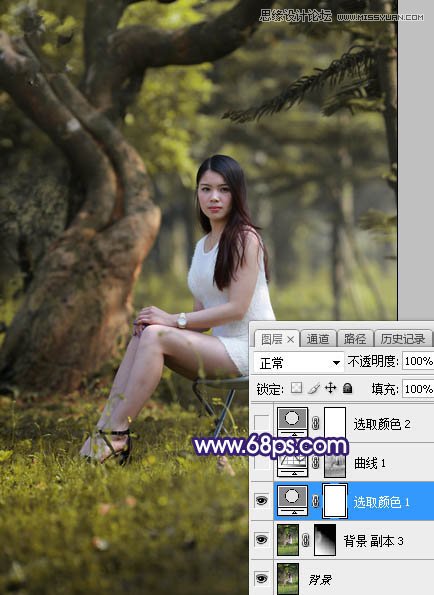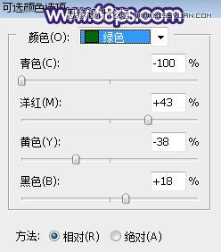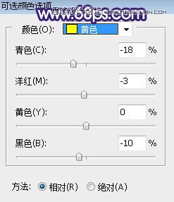 2、创建可选颜色调整图层,对黄色,绿色进行调整,参数设置如图2,3,效果如图4。这一步给图片增加黄褐色。