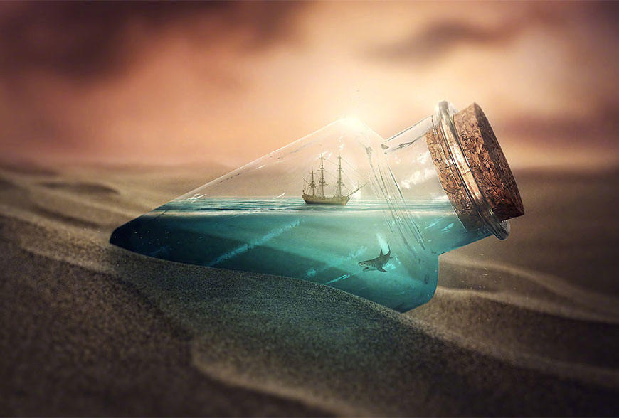 效果图以小瓶子为载体,里面蕴含了一个大世界:广阔的海洋上大型船只正在航行,可能是一次冒险航行,海面相对来说比较平静,不过水下有潜在的危险。。。最终效果