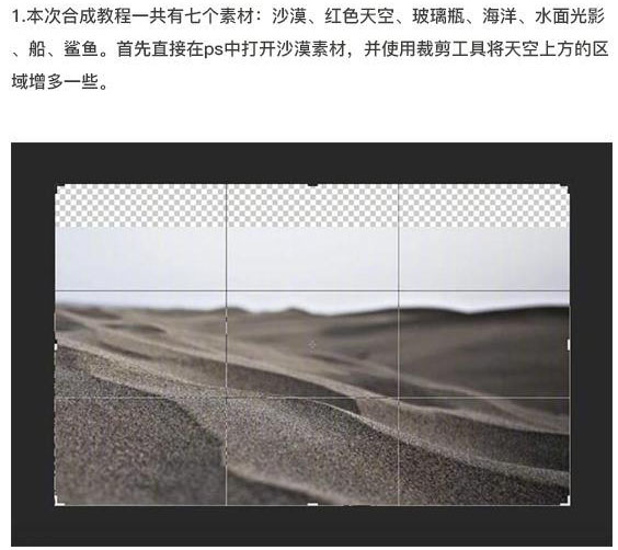 本次一共有7个素材:沙漠、红色天空、玻璃瓶、海洋、水面光影、船、鲨鱼。