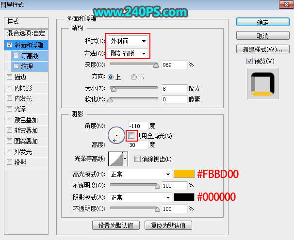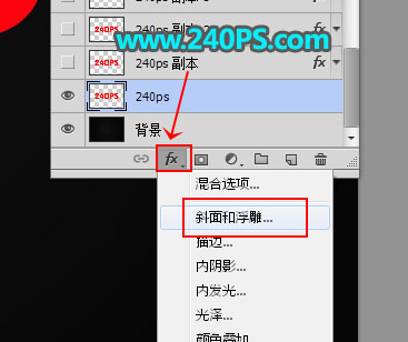 6、给文字添加图层样式。点击箭头位置的按钮,选择“斜面和浮雕”。